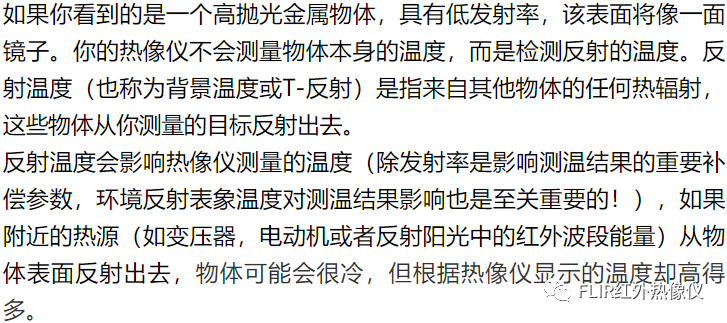 對(duì)于發(fā)射率較高的物體,反射溫度的影響較小。但對(duì)于低發(fā)射率的物體來(lái)說(shuō),反射溫度是關(guān)鍵因素。隨著發(fā)射率的降低,你所測(cè)量的熱量更多的是來(lái)自周圍物體的表面,而不是你正在檢查的目標(biāo)。