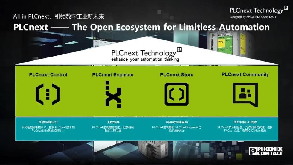 菲尼克斯電氣面向未來的PLCnext技術(shù)平臺(tái),通過開放式控制平臺(tái)、模塊化工程軟件和數(shù)字化應(yīng)用市場(chǎng)的有機(jī)組合,可以輕松應(yīng)對(duì)復(fù)雜多變的數(shù)字化工業(yè)需求。它支持多種云連接,集成開源軟件,并擁有PLCnext Store用戶生態(tài)的力量,能夠輕松應(yīng)對(duì)工業(yè)物聯(lián)網(wǎng)世界的所有挑戰(zhàn)。