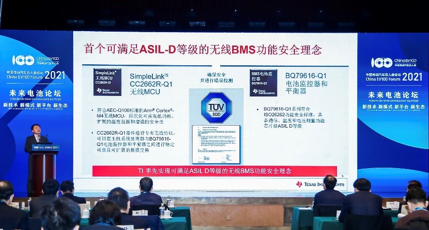 在演講中,師英介紹了德州儀器剛剛在2021國(guó)際消費(fèi)類(lèi)電子產(chǎn)品展覽會(huì)(CES2021)率先發(fā)布的業(yè)內(nèi)首個(gè)通過(guò)T?VS?D評(píng)估、滿足ISO26262ASILD功能安全等級(jí)的無(wú)線電池管理(WBMS)解決方案。該解決方案可以提供業(yè)界出色的網(wǎng)絡(luò)可用性(超過(guò)99.999%),并可支持跨多平臺(tái)可靠擴(kuò)展,幫助汽車(chē)客戶設(shè)計(jì)制造更加安全、可靠、高效且行駛更遠(yuǎn)的電動(dòng)汽車(chē)。