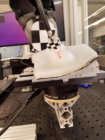 他們?cè)O(shè)計(jì)的模型解讀了從模擬機(jī)器人手術(shù)中收集到的接觸力信息。該應(yīng)用程序包括DaVinciResearch Kit機(jī)械臂,ATI 的Gamma六維力和力矩傳感器和由仿生硅材料制成的“病人”。當(dāng)外科醫(yī)生執(zhí)行手術(shù)時(shí),機(jī)器人施加在硅模型上的力和力矩會(huì)被實(shí)時(shí)捕捉,從而在一定程度上反映病人的感受。