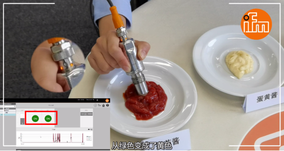 當將探頭拿出,即使它的上面粘附著番茄醬,指示燈還是綠色,開關(guān)點沒有被觸發(fā)。