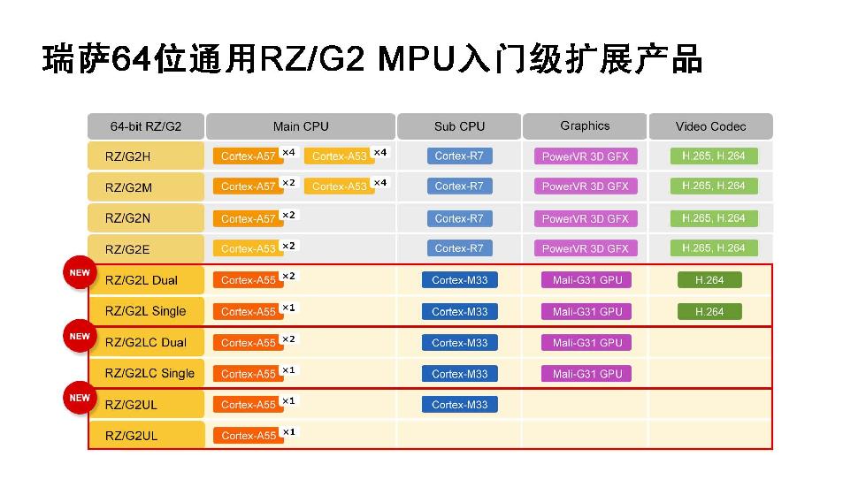 ●RZ/G2L和RZ/G2LC:雙核或單核Cortex-A55(1.2 GHz)及Cortex-M33