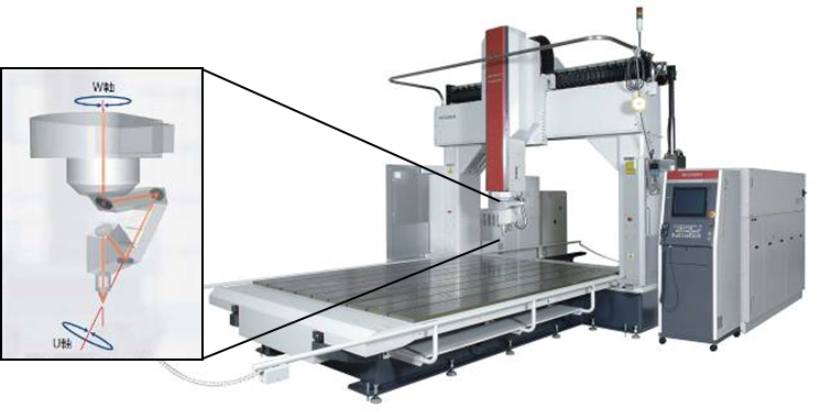 作為五軸聯(lián)動的三維激光加工機,三菱電機三維激光加工機切割頭分為一點指向型和偏置型兩種切割頭。所謂一點指向型切割頭就是,回轉軸(W軸)和加工端點始終在同一軸上,以旋轉的W軸和跟Z軸成45度角的U軸聯(lián)動實現(xiàn)(參照圖1)。
