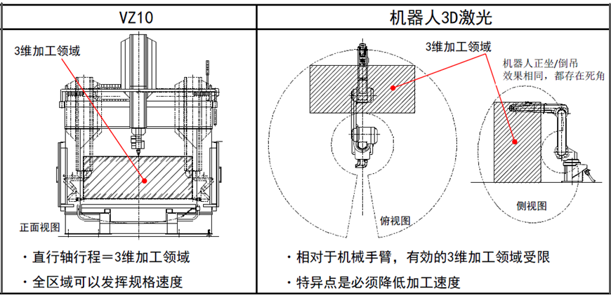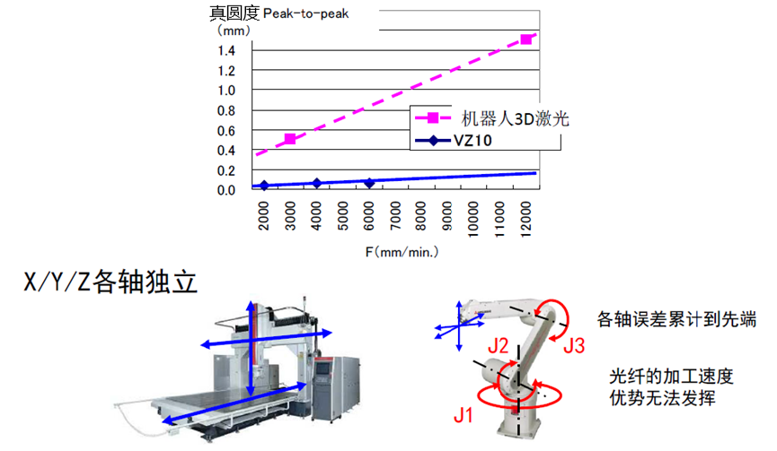 傳統(tǒng)機器人三維激光切割,各關節(jié)誤差累積,加工精度受限,難以提高。而VZ10系列采用的五軸龍門結構剛性強,加工精度有著壓倒性的優(yōu)勢。(參照圖2)