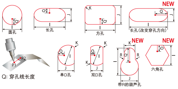 同時示教盒中保留了備受好評的孔加工指令,并在此基礎上追加了新的孔加工命令,包括“帶R的葫蘆孔”“六角孔”和“改變穿孔方向長孔”的功能,可根據(jù)D指令校正尺寸。(參照圖6)