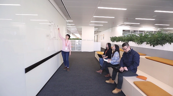 最最重要的要屬頭腦風(fēng)暴區(qū)了。在這里,大腦活躍著,每個人各抒己見,踴躍發(fā)言,階梯式的座位和白色的寫字板遙相呼應(yīng),good ideas分分鐘碰撞與迸發(fā)。