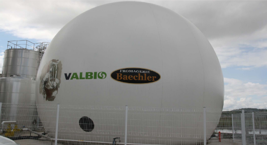 奶酪制造商Baechler在法國(guó)有一個(gè)奶酪工廠,不同種類的奶酪在這里生產(chǎn)和熟成。在生產(chǎn)過(guò)程中,由鍋爐生產(chǎn)的蒸汽被用來(lái)當(dāng)作輔助介質(zhì)。在過(guò)去,天然氣管網(wǎng)中的天然氣是加熱鍋爐的主要能源。然而,為了不受制于不斷波動(dòng)的燃?xì)鈨r(jià)格,奶酪制造商希望尋找更合適的解決方案,用于能源的供應(yīng)。因此,在工程公司Valbio的幫助下,奶酪工廠建立了自己的沼氣工廠。Valbio公司同時(shí)也運(yùn)行整個(gè)系統(tǒng):乳清在消化罐中發(fā)酵生成沼氣,而乳清是生產(chǎn)乳酪時(shí)的副產(chǎn)品。因?yàn)殄仩t不是時(shí)刻在運(yùn)行的,必要時(shí),沼氣可以在一個(gè)儲(chǔ)氣罐中進(jìn)行儲(chǔ)存。