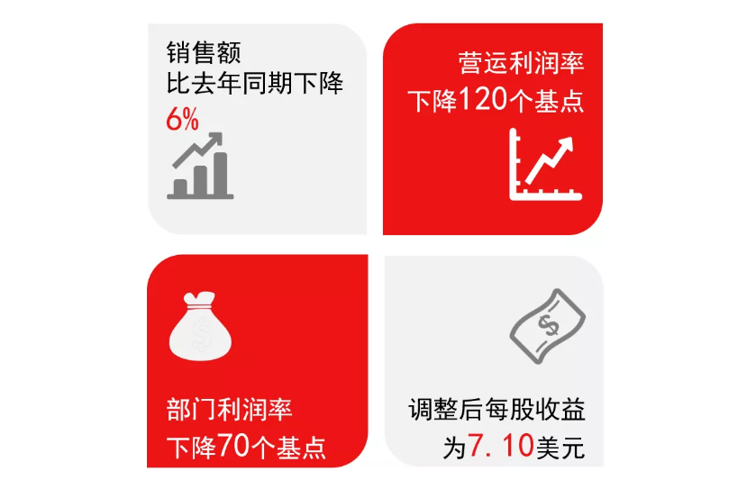 內(nèi)生式銷售額下降12%;部門利潤率降低380個(gè)基點(diǎn)至18.7%