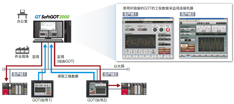 ◆ SoftGOT-GOT鏈接功能讓作業(yè)現(xiàn)場的GOT與辦公室的SoftGOT關(guān)聯(lián)。(GT27 GT25)