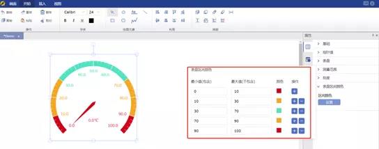 以儀表盤為例,設(shè)置區(qū)間顏色后,在畫面上能立馬看到對應(yīng)的設(shè)置效果。