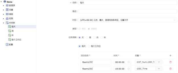 可以靈活設(shè)置動作的執(zhí)行時間和周期。將一個或多個任務(wù)添加到時間表中,并為每個任務(wù)設(shè)置對應(yīng)的變量,當(dāng)?shù)竭_(dá)該時間時,系統(tǒng)自動觸發(fā)變量對應(yīng)的動作。
