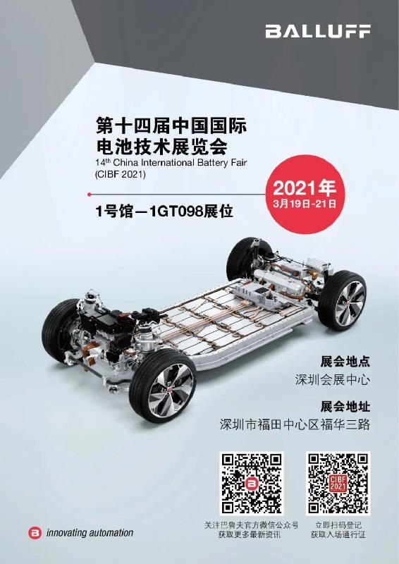 巴魯夫?qū)⒂谙轮埽?月19-21日)參加第十四屆中國(guó)國(guó)際電池技術(shù)展覽會(huì)(CIBF 2021),和大家共同探索動(dòng)力電池自動(dòng)化生產(chǎn)新思路和創(chuàng)新解決方案。展會(huì)現(xiàn)場(chǎng),我們將向大家展現(xiàn)我們應(yīng)用于動(dòng)力電池生產(chǎn)的相關(guān)前沿技術(shù)和解決方案。