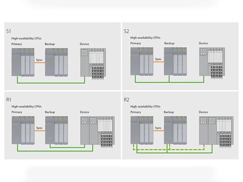 只有在R1或R2系統(tǒng)冗余的情況下才能實(shí)現(xiàn)可用性最大化。這涉及在冗余通信接口的現(xiàn)場(chǎng)設(shè)備上的附加實(shí)現(xiàn),并與遠(yuǎn)程I/O一起使用。R2及其四路連接代表了復(fù)雜性的高級(jí)別。