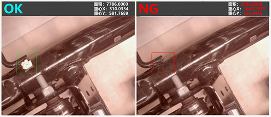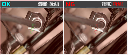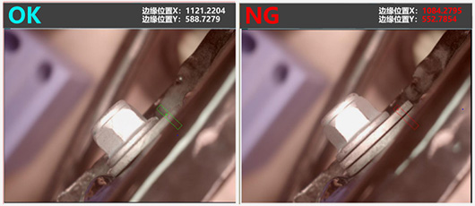 ● 視覺(jué)傳感器根據(jù)形狀、面積等對(duì)指定檢查部位進(jìn)行品質(zhì)檢查。通過(guò)邊緣計(jì)算,定義正確安裝狀態(tài)下的邊緣位置的坐標(biāo)點(diǎn),一旦坐標(biāo)值出現(xiàn)偏差則判斷為NG。