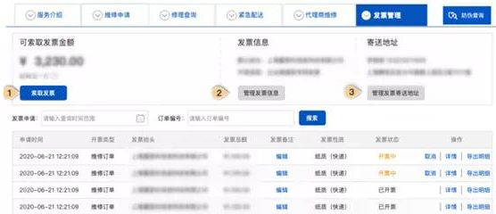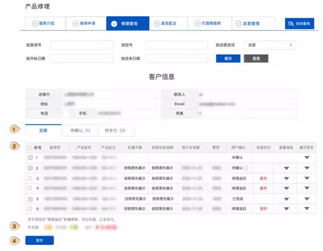 以往維修服務(wù),和維修部門反復(fù)多次電話/郵件聯(lián)絡(luò)溝通,甚至需要親自往返數(shù)次,才能完成付款和開票流程,增加了接觸的風(fēng)險(xiǎn),并且耗時(shí)耗力; 現(xiàn)在,從申請、查詢、維修、付款到開票的全部環(huán)節(jié),只需要線上操作就夠了! 維修自助服務(wù),減少接觸,線上“一站式”全部搞定!