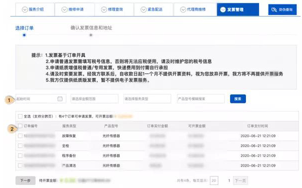 3、可根據(jù)訂單支付起始時(shí)間,金額,服務(wù)類型,產(chǎn)品型號進(jìn)行搜索;通過勾選,可申請開票;列表底部實(shí)時(shí)顯示勾選的訂單總額;
