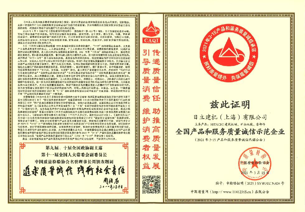 日立建機(jī)獲2021全國產(chǎn)品和服務(wù)質(zhì)量誠信示范企業(yè)