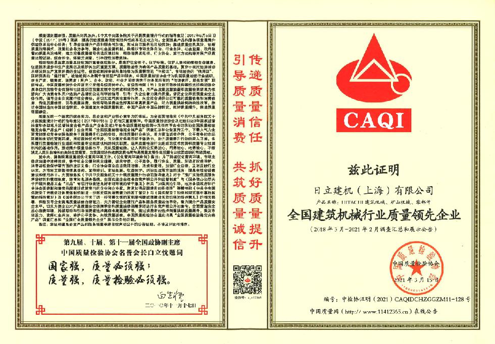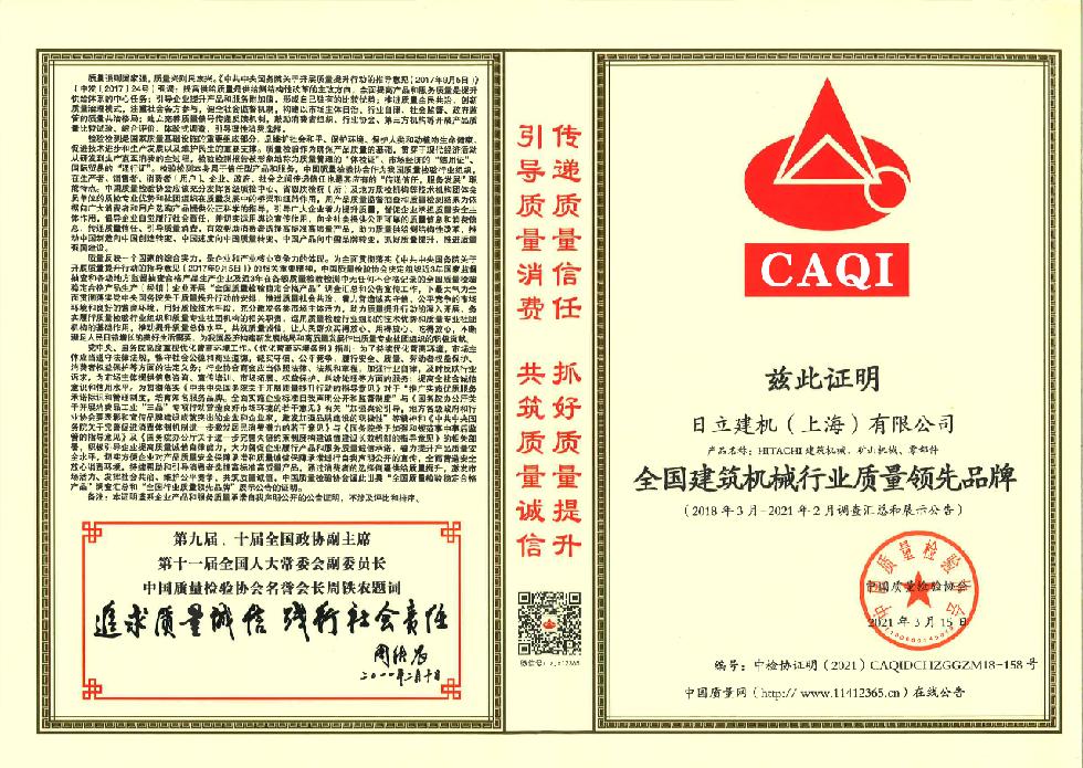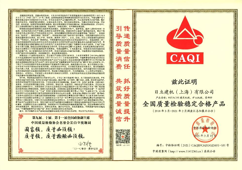 日立建機(jī)獲2021全國質(zhì)量檢驗(yàn)穩(wěn)定合格產(chǎn)品