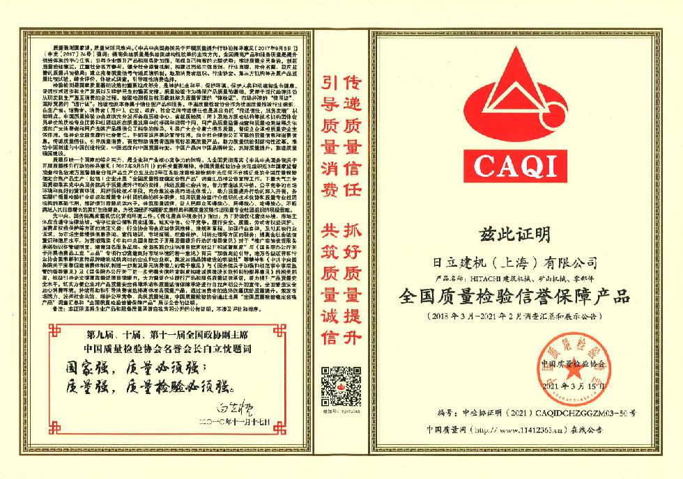 日立建機(jī)獲2021全國質(zhì)量檢驗(yàn)信譽(yù)保障產(chǎn)品