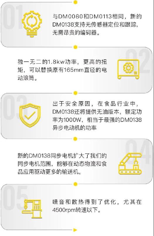 與現(xiàn)有的DM 0080和DM 0113系列一樣,DM 0138提供極高的加速和制動(dòng)性能,能耗很低,且無(wú)需添加額外傳感器即可精確定位所輸送物料的位置,極大簡(jiǎn)化了物料傳輸中所涉及的包裝等各項(xiàng)加工流程的自動(dòng)化集成。DM 0138直徑138毫米、輸出功率為1.8千瓦,設(shè)計(jì)非常緊湊:以往只有直徑165毫米的傳統(tǒng)異步滾筒才能實(shí)現(xiàn)相近的輸出。
