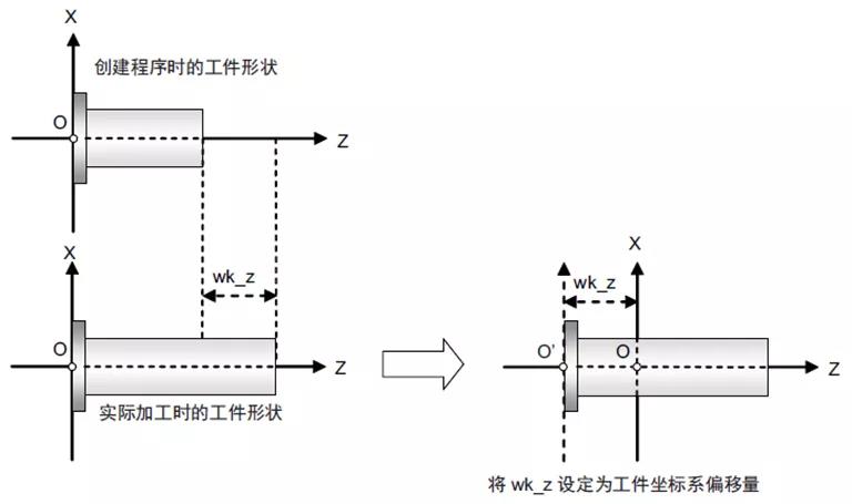 在車床加工中如更換加工件,其Z向長度發(fā)生變更,按照以往方式必須對(duì)所有刀具Z向進(jìn)行再次“對(duì)刀“。導(dǎo)致工作效率低下,增加操作者的負(fù)擔(dān)。使用工件坐標(biāo)系偏移功能可以輕松解決以上顧慮。