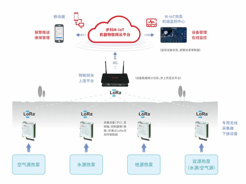 該方案主要由KW系列LoRa無(wú)線數(shù)據(jù)采集器和物聯(lián)網(wǎng)關(guān)等硬件,以及步科機(jī)器物聯(lián)網(wǎng)云平臺(tái)組成,高效解決存量熱泵機(jī)房無(wú)預(yù)制網(wǎng)絡(luò)、無(wú)4G信號(hào)、無(wú)人值守造成的設(shè)備管理、數(shù)據(jù)管理難題。