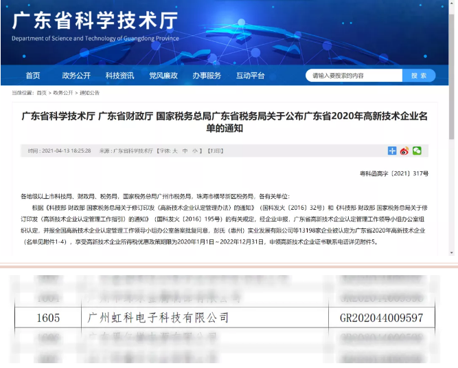 據(jù)廣東省科技廳、廣東省財政廳、國家稅務總局廣東省稅務局4月8日聯(lián)合下發(fā)的《關于公布廣東省2020年高新技術企業(yè)名單的通知》,經(jīng)企業(yè)申報,廣東省高新技術企業(yè)認定管理工作領導小組辦公室組織認定,并報全國高新技術企業(yè)認定管理工作領導小組辦公室備案批復同意,廣州虹科電子科技有限公司被認定為廣東省高新技術企業(yè)