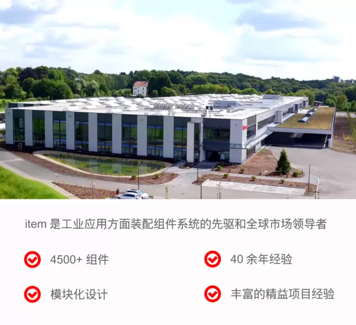 item 是工業(yè)應(yīng)用方面裝配組件系統(tǒng)的先驅(qū)和全球市場(chǎng)領(lǐng)導(dǎo)者,專注工業(yè)鋁型材 40 余年,深諳行業(yè)需求,目前擁有全球最豐富、全面的鋁型材及配件系統(tǒng) -- 7000 多個(gè)可用于機(jī)械設(shè)備、工作臺(tái)、自動(dòng)化解決方案和精益生產(chǎn)的高品質(zhì)組件。