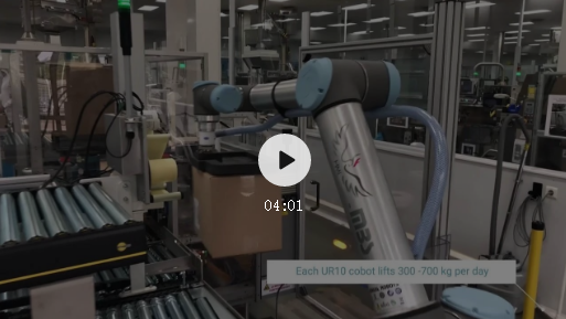 ▲每臺UR10協(xié)作式機器人每天可搬運300-700公斤的托盤