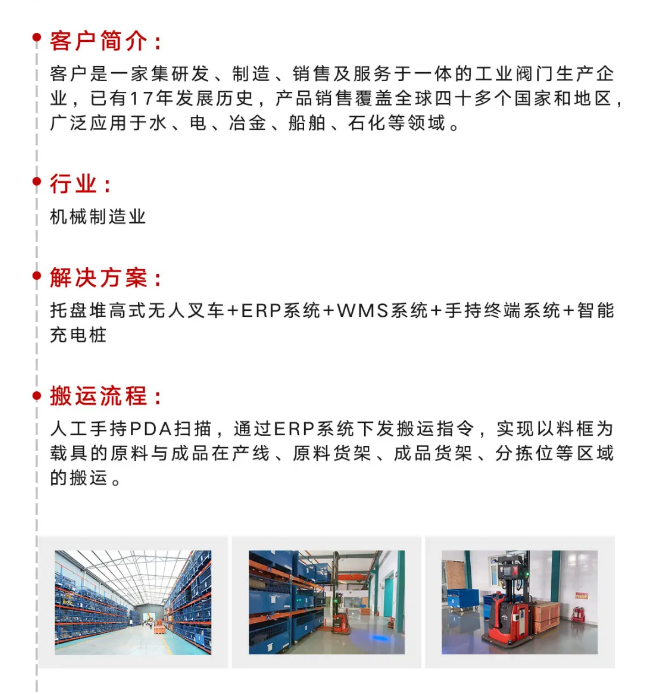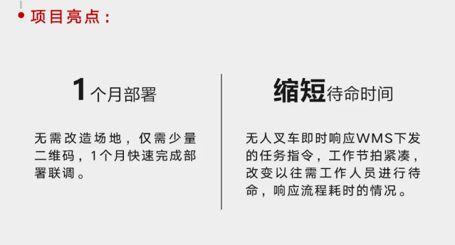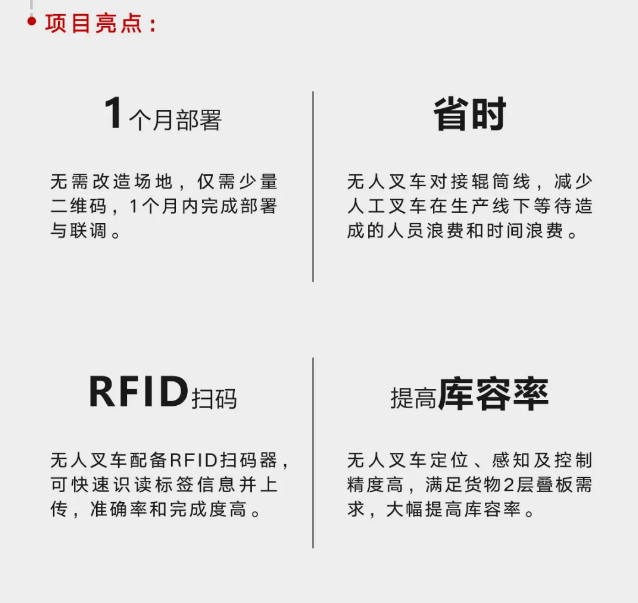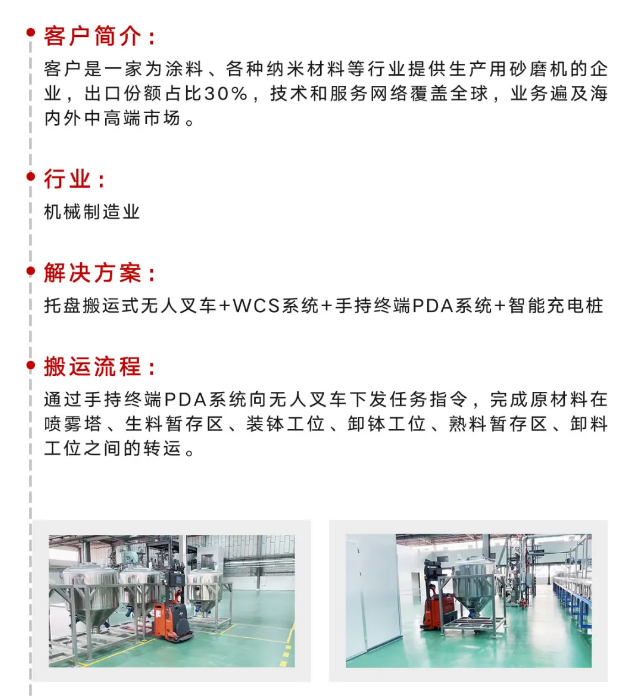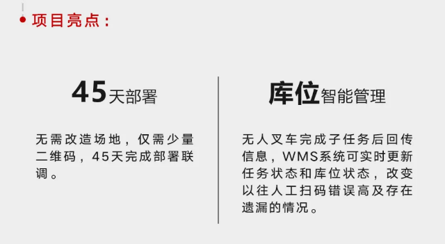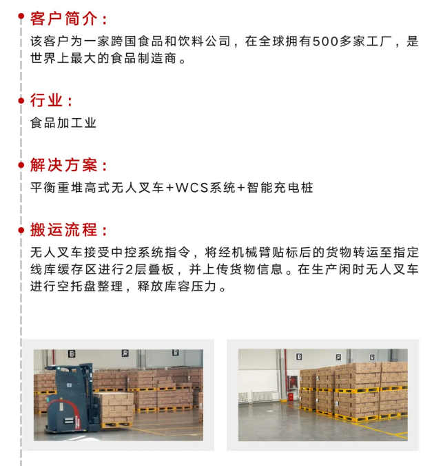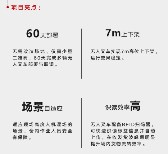 下文挑選展示近期部分客戶案例,涵蓋了7m高位上下架、貨物疊板、線邊轉(zhuǎn)運、平面搬運等場景,協(xié)助客戶工廠/倉庫實現(xiàn)柔性化生產(chǎn)與智能化管理,部署周期快達30天。