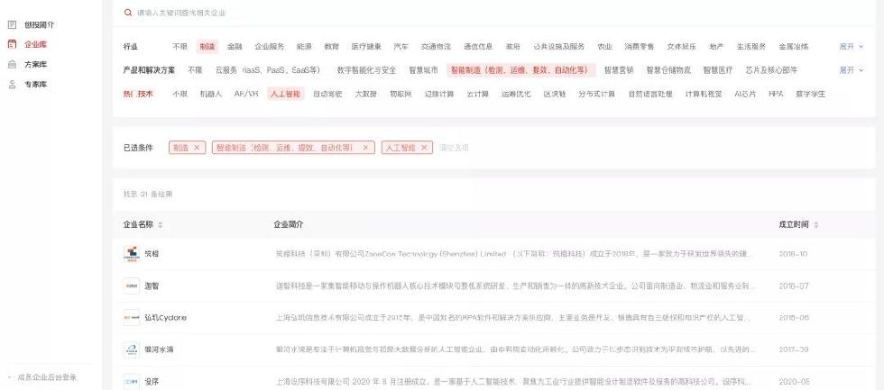 在點(diǎn)擊了左側(cè)導(dǎo)航欄的“企業(yè)庫(kù)”后,用戶可選擇通過(guò)“行業(yè)”、“產(chǎn)品和解決方案”和“熱門技術(shù)”下的具體標(biāo)簽精確搜索目標(biāo)企業(yè),也可通過(guò)上方的搜索框直達(dá)感興趣的企業(yè)。