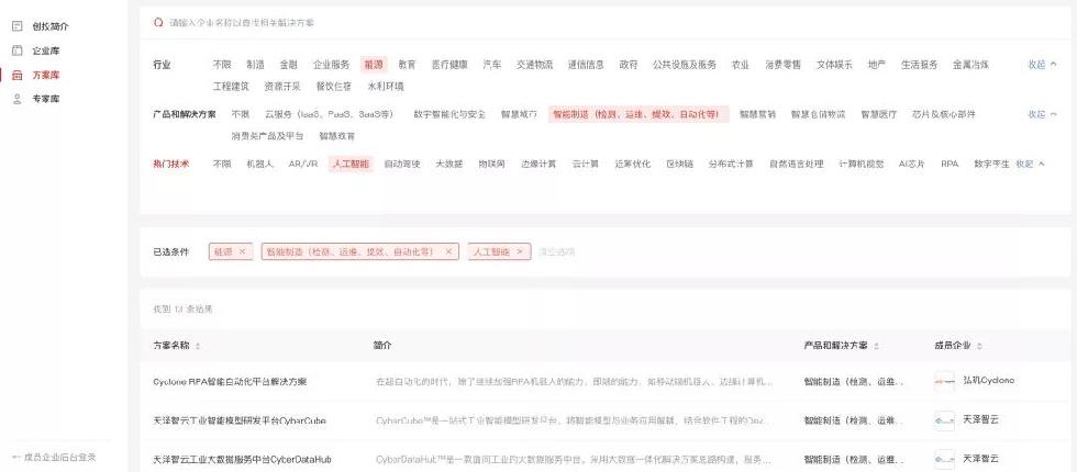 “方案庫(kù)”的操作流程與企業(yè)庫(kù)類似,通過(guò)點(diǎn)選“行業(yè)”、“產(chǎn)品和解決方案”、“熱門技術(shù)”標(biāo)簽,即可查詢相應(yīng)的產(chǎn)品、方案和具體案例,深入了解產(chǎn)品、方案的實(shí)際應(yīng)用場(chǎng)景和落地情況。