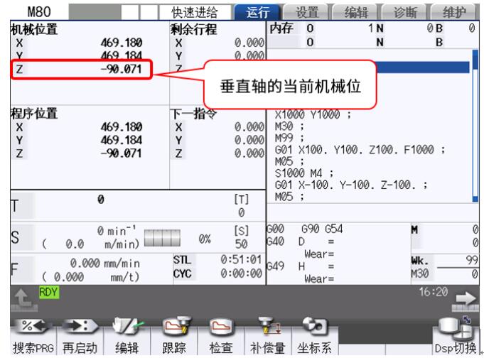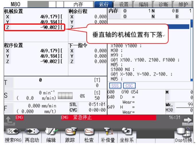 2.未開啟垂直上拉功能按下緊急停止按鈕后,該機床坐標(biāo)畫面如圖4;可以看到Z軸機械位置有下落。