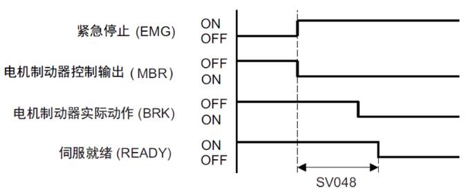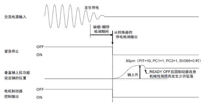 當(dāng)發(fā)生緊急停止時,因制動器動作的延遲而導(dǎo)致垂直軸墜落。發(fā)生急停時,按照參數(shù)設(shè)定的時間延遲伺服的READY OFF,消除制動器開始工作前的無控制時間。