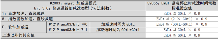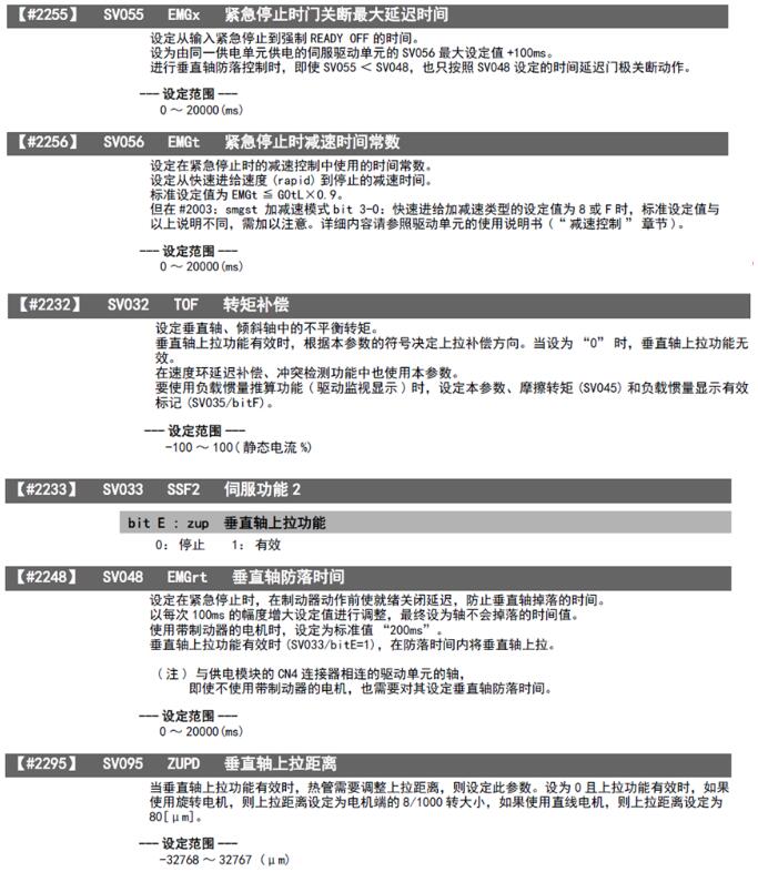 [2]將緊急停止時門關(guān)斷最大延時時間(SV055)設(shè)定為一般加減速時間常數(shù)+100ms,并在緊急停止時減速時間常數(shù)(SV056)中設(shè)定該軸的標(biāo)準(zhǔn)設(shè)定值。