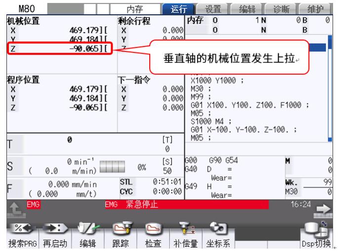 3.開啟垂直上拉功能按下緊急停止按鈕后,該機床坐標(biāo)畫面如圖5;可以看到Z軸機械位置發(fā)生上拉。