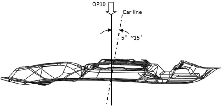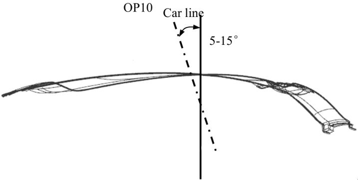 綜合考慮側(cè)圍外板的拉延成形工藝,一般側(cè)圍外板的沖壓方向?yàn)榕c車身Y向成8-15°夾角,如圖 1 所示。