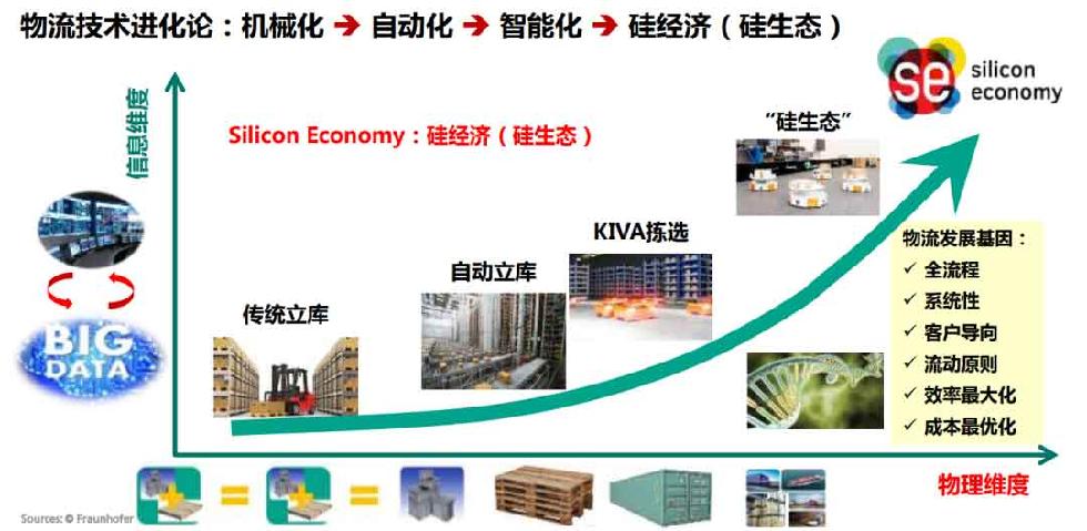 依據(jù)這些物流發(fā)展基因,德國弗勞恩霍夫物流研究院分析了物流的技術(shù)發(fā)展路徑,并認(rèn)為物流技術(shù)的進(jìn)化歷程是從機(jī)械化、自動化、智能化再到硅經(jīng)濟(jì)(硅生態(tài))。