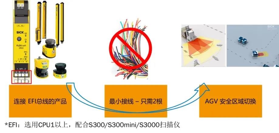 EFI讓SICK安全傳感器與安全PLC之間,僅通過(guò)2根接線(xiàn)就實(shí)現(xiàn)了高級(jí)擴(kuò)展功能,讓連接與控制瞬間變得高效、便捷、簡(jiǎn)單。從此,SICK-AGV-EFI套裝搭配S300系列安全掃描儀作為集成到AGV上的典型安全系統(tǒng)應(yīng)用。SICK安全系統(tǒng)集成也變得從未如此輕松并廣受青睞!