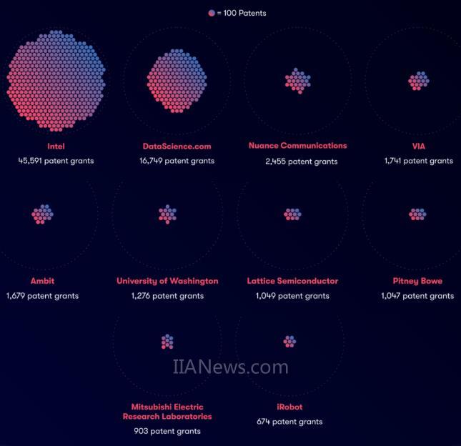 在進(jìn)行統(tǒng)計(jì)的上千個(gè)AI專利中,大約52%的專利被授予給不同企業(yè),獲得AI專利授予的企業(yè)多為計(jì)算機(jī)、互聯(lián)網(wǎng)領(lǐng)域企業(yè)。其中獲得AI專利授予最多的企業(yè)擁有近5萬個(gè)AI專利授權(quán),是第二名專利授予數(shù)量的3-4倍。