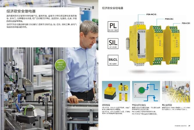 菲尼克斯推出了專為中國市場設計的經(jīng)濟型安全繼電器產(chǎn)品,符合PLe和SIL3的安全等級認證,擁有可接無源觸點(急停、安全門)的PSR-CE1,接24V有源信號(光幕、激光掃描儀)的PSR-CE2,以及有源和無源均可的PSR-MC45。