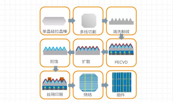 圖1是典型的晶硅電池生產過程,經過切片、清洗制絨、擴散工藝后,硅片已經具有光電轉換能力,但是,光在硅片表面的反射使得光損約1/3,即使經過表面制絨仍然損失11%左右,為了進一步減反射,需要利用光的干涉原理,在其表面制作一層減反射膜,以獲得電流輸出的能力增強。對于PECVD而言,提供高品質可靠性,以及參數控制的精準與同步性能,可以降低不良品率,降低單片成本。