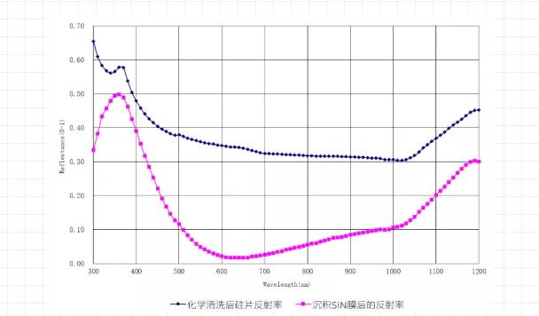 如果在晶硅電池片表面增加一個氮化硅(SiN)涂層,其可以降低表面反射率,進而提升光的發(fā)電效率。圖2可以看到,通過減反射工序,光的反射率大幅下降。