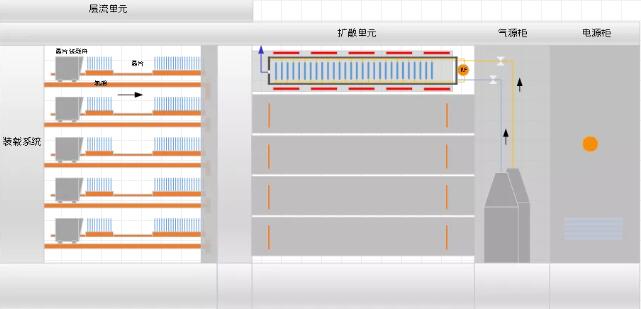 圖3是一個管式PECVD設備的結構,裝載系統(tǒng)主要是負責通過定位控制,將放置于石墨舟中的硅片送至爐體中,在擴散部分,由等離子電源、氣體輸送系統(tǒng)、加熱系統(tǒng)、真空泵等一起工作,將SiH和SiN氣體通過RF射頻系統(tǒng)分離為等離子體,并沉積到硅片表面,形成薄膜,這個反應的過程可以形成多種不同的薄膜,其可以針對不同的光進行減反射的作用,反應完成后由退舟系統(tǒng)回到裝載系統(tǒng),下料。