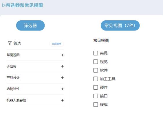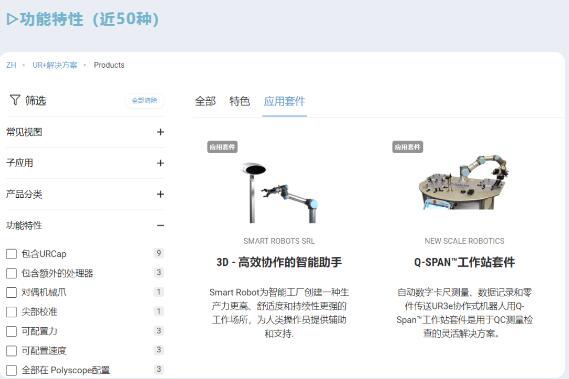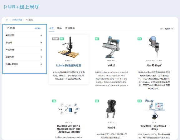 UR+在線展廳已收納數(shù)百種UR+產(chǎn)品及應(yīng)用套件。近期,我們上線了新的篩選器,用戶可以根據(jù)應(yīng)用、產(chǎn)品種類、功能特性等篩選所需UR+產(chǎn)品,快速找到您想要的東西。