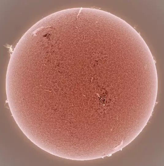 Alan Friedman是一位著名的天文愛(ài)好者和天文攝影師,他在位于紐約州布法羅市的自家后院中拍下了很多撼人心魄的太陽(yáng)影像。他一直使用各種型號(hào)的相機(jī)(像素從30萬(wàn)到600萬(wàn)不等),并與采用氫α濾光鏡 (656.3 nm) 的太陽(yáng)望遠(yuǎn)鏡組合進(jìn)行拍照。以下照片是由不同曝光次數(shù)的太陽(yáng)影像合并或疊加在一起制作而成,其中的細(xì)絲是日珥的最終形態(tài)。暗色區(qū)域是小太陽(yáng)黑子,而較亮譜斑(點(diǎn))是高度磁化區(qū)域。