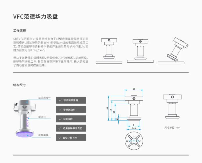 SRT通過(guò)對(duì)特殊的聚合物材料和μm級(jí)的表面工藝不斷研發(fā)創(chuàng)新,使吸盤(pán)與光滑物體表面產(chǎn)生強(qiáng)烈的分子間作用力,吸附力達(dá)0.5kg/cm2。聚合優(yōu)勢(shì),推出全新產(chǎn)品——VFC系列范德華力吸盤(pán)。這款吸盤(pán)可牢牢吸附工件表面且無(wú)印記殘留,為處理如紙板、玻璃、電路板、金屬、塑料和光滑包裝等抓取難題帶來(lái)更多解決方案。
