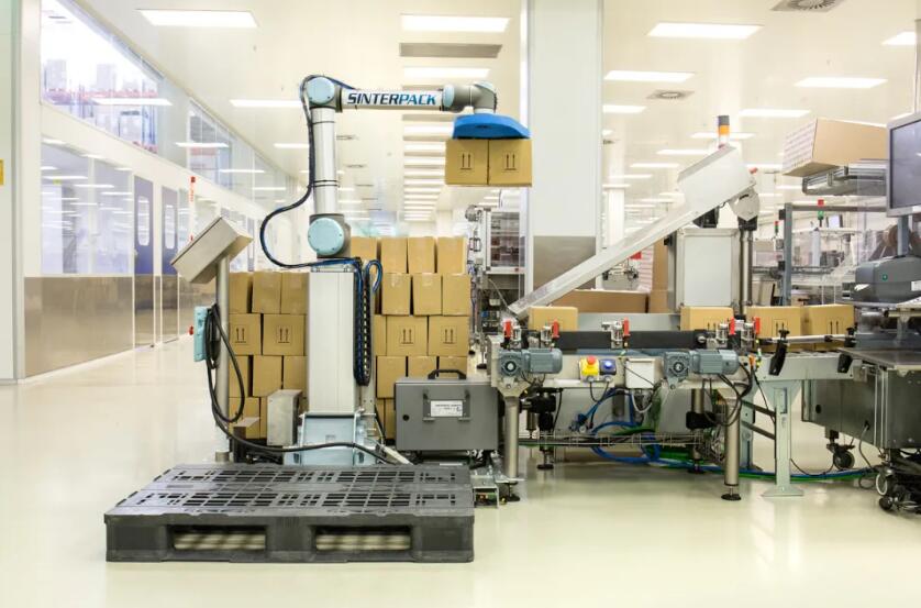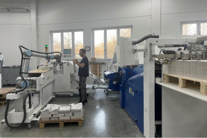 ▲德國公司Geiselberger Gmbh.利用UR10機器人碼垛印刷品,機器利用率高達100%。