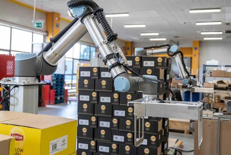 ▲在聯(lián)合利華的波蘭卡托維茲工廠中,UR10協(xié)作機器人在8小時的輪班工作中能夠碼垛約1100個箱子。