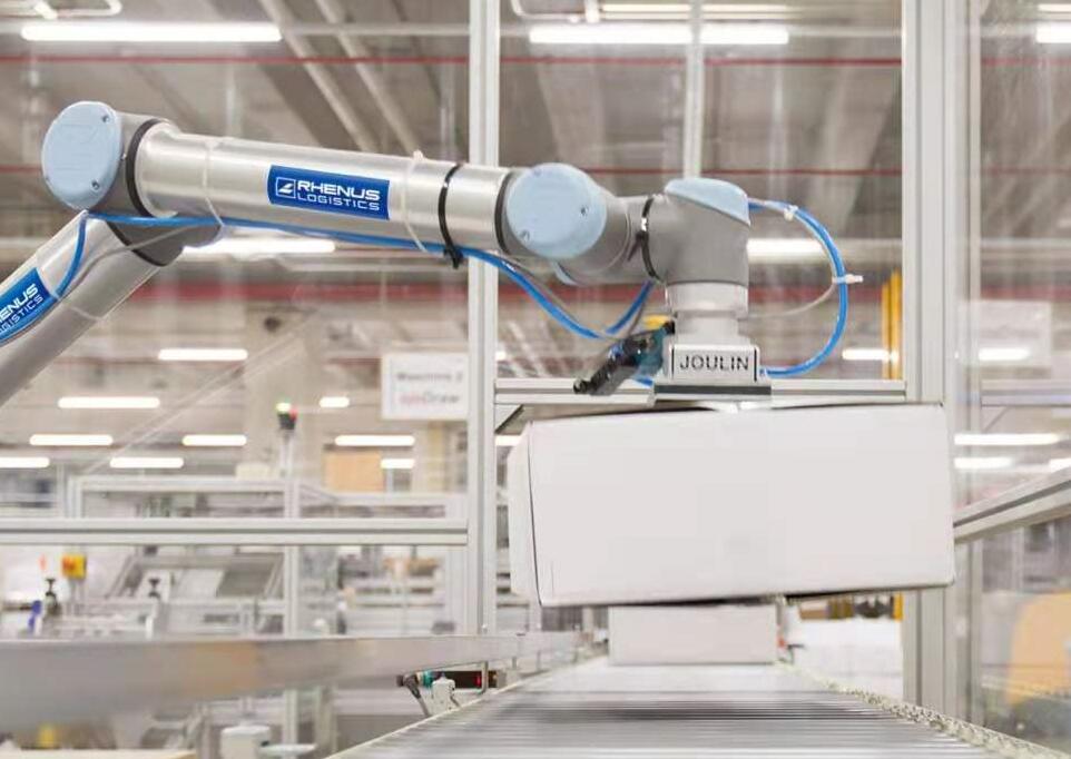 ▲在德國物流公司Rhenus內(nèi),UR10把箱子放在傳送帶上,運往貼標機。UR10能夠處理多種尺寸和重量的箱子
